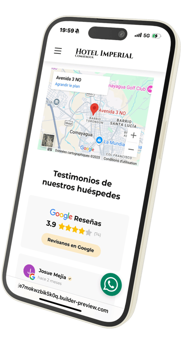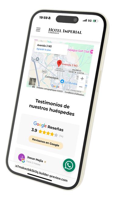 Projet en cours, avec mise en avant des chambres, services et réservation via Airbnb. Intégration de Google Reviews et WhatsApp